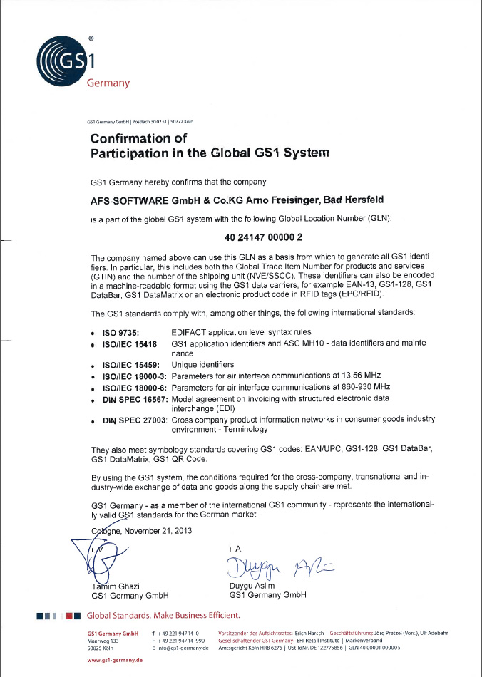 AFS-Software ist Teil des globalen GS1 Systems mit nachfolgender GLN: